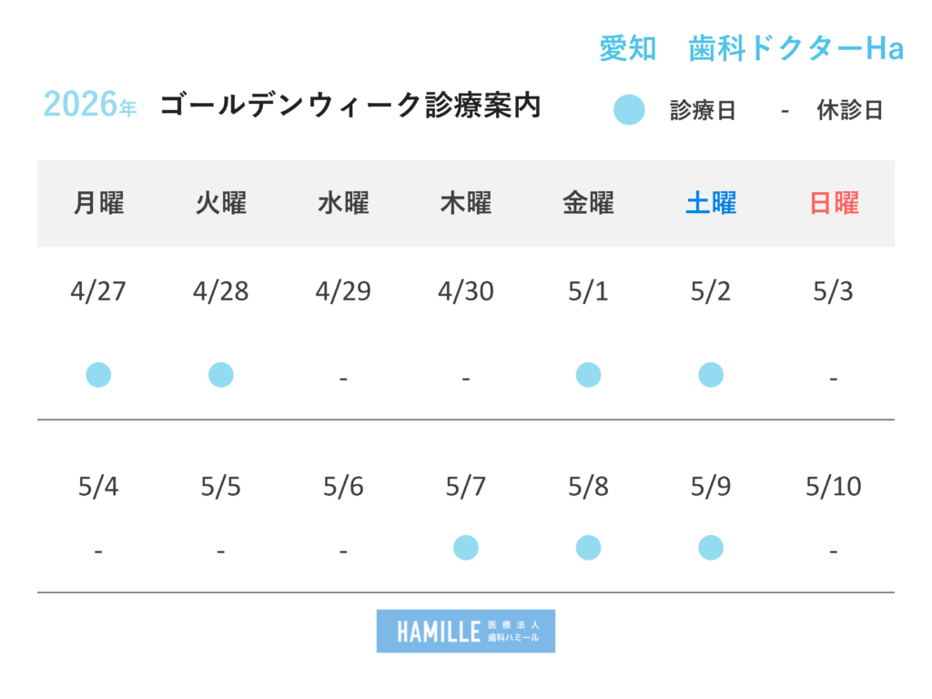 2026/04/23 2026ゴールデンウィーク期間 – 診療のご案内 ▶半田市エリア 〇歯科ドクターHa 当院では、ゴールデンウィーク期間中の5月1日(金曜)ならびに5月2日(土曜)は通常通り診療を行っています。